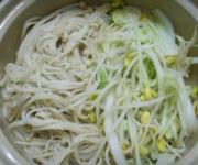 锅中烧热水,放入适量盐,放入豆芽和撕成小片的大白菜和金针菇煮至断生,捞出铺在一个深盆的底部待用,放点葱花在上面。