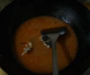 锅里放油把蒜茸爆香后,将郫县豆瓣放入锅里小火慢炒出红油。