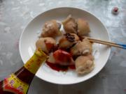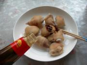 煮好的猪手捞出,挑出葱姜,然后加入海鲜酱。