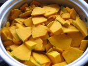 把南瓜切成一片片的上锅蒸,大概十分钟左右就熟了。