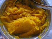 蒸好之后,捞出来,用勺子把它按成融融的。