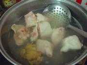 猪蹄捞出来,去掉骨头切条。葱姜丢掉。