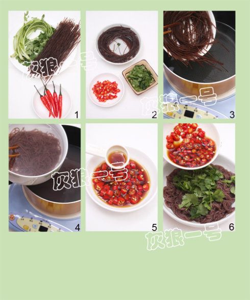 原料:蕨根粉100克、新鲜小辣椒5个、香菜2棵、醋4茶匙、盐1/4茶匙、生抽1茶匙、香油1/2茶匙