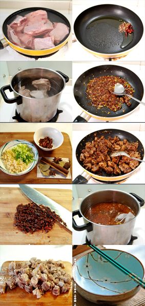 配料:葱、姜、蒜适量,郫县豆瓣酱1大勺,干辣椒4、5根,香叶2-3片、八角2个、桂皮1块、花椒8、9粒、草果1个