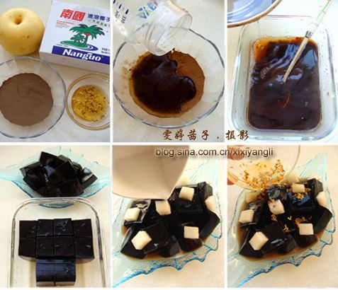 主要食材:龟苓膏粉25克,桂花蜜三勺,椰奶或者炼乳3勺,雪梨50克。(这是3-4个人的量哦)