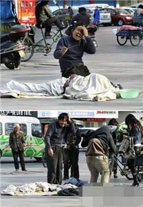 2010年2月,网上流传一组有趣的照片,一位扮尸体或重病患者的乞丐因为要上厕所导致“表演”穿帮,哭他的另一个乞丐不好意思地笑了,笑容相当憨。 菲律宾马尼拉街头狗代替主人行乞