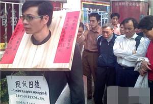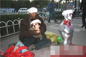 手拿着”滴血的人头“,头戴白色孝布。这样”血淋淋”的一幕上演于2009年11月在咸阳市最繁华的闹市区人民路。原来,时年49岁的乞丐王侃牢只为博得路人同情多讨钱,竟然用上了这样“血腥”招数。 男子脖子挂枷锁乞讨 自称创新型乞丐
