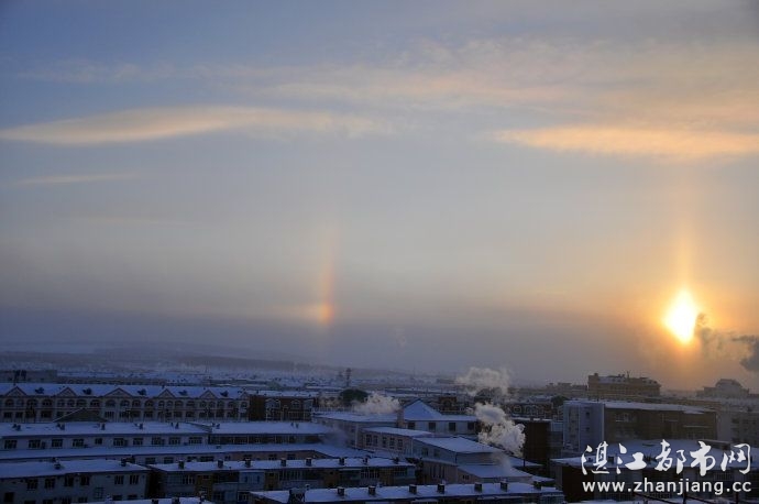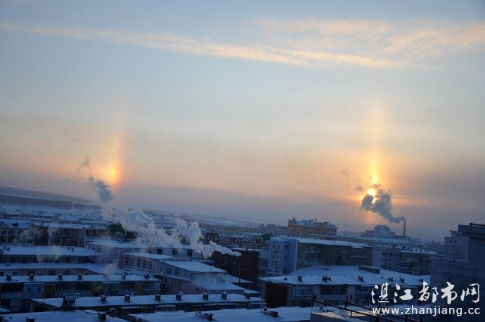 阅读(2457) 回复(5) 查看全文>> - [2012-12-15]内蒙古牙克石天空惊现“3个太阳” [图]内蒙古一网友在办公室窗外抓拍到的奇观:一看看去,晚霞之中“3个太阳”挂在空中。难道末日要来临了?no,这只是日晕、幻日同时出现! 每每看到类似奇观,有些人便神乎其神,尤其是与2012世界末日之说牵扯起来,实属滑稽。 据专家介绍,“3个太阳”的景色其实是日晕和幻日现象,是高空薄云中的冰晶产生的折射现象。因为当天上海上空有一层比较高的高云,它由冰晶形成,由于冰晶的形态类似于物理上的“三棱镜”,起了分光作用,对日光进行了折射,所以产生幻日弧光,或叫环天顶弧。