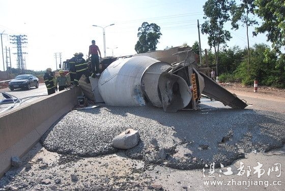 事故现场,一台车牌号为粤k17667的水泥罐车横躺在路边水泥护栏处,车体严重变形,车内装载的水泥和柴油遍地都是,驾驶员双腿被卡在严重变形的座椅和方向盘以及刹车之间,身体也被各类硬物卡着,现场情况危急。