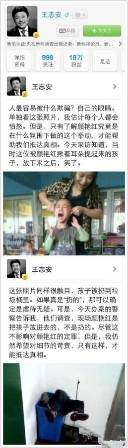 揪耳朵、贴嘴巴、扔垃圾桶……一系列的虐童照片,让网友对幼师颜艳红充满了愤怒。而10月29日深夜,央视记者、评论员王志安却在其微博对“虐童照片”发表了不同的看法。