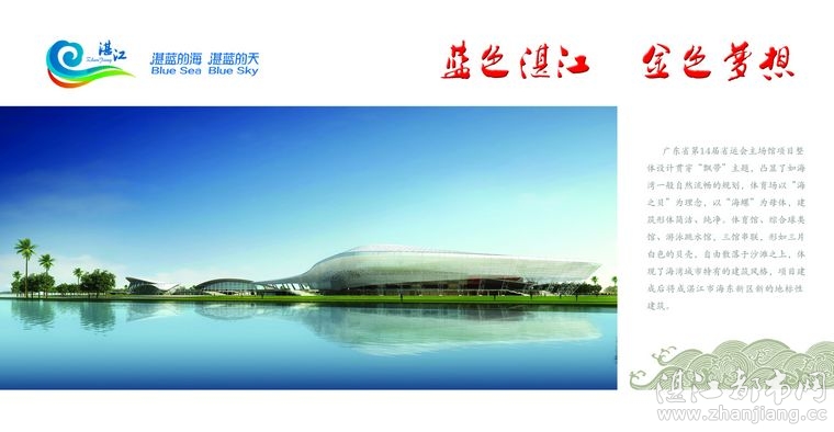 第二枚“蓝色湛江、金色梦想”是首次发行的广东省第14届省运会主场馆明信片,表现了湛江将乘着举办第14届省运会的东风,实现湛江走向世界的梦想;