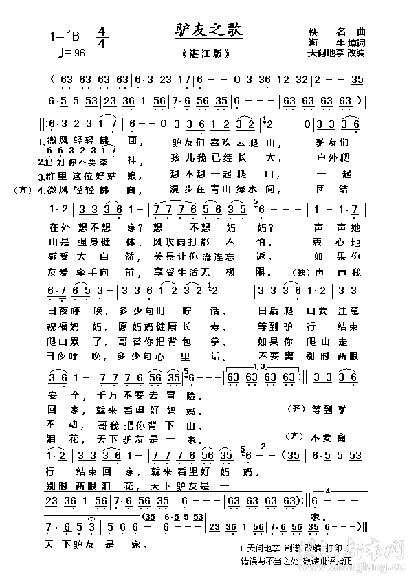 - [2013-10-30]试为:海牛的《驴友之歌》(湛江版)制谱 [图]试为:海牛的《驴友之歌》(湛江版)制谱: