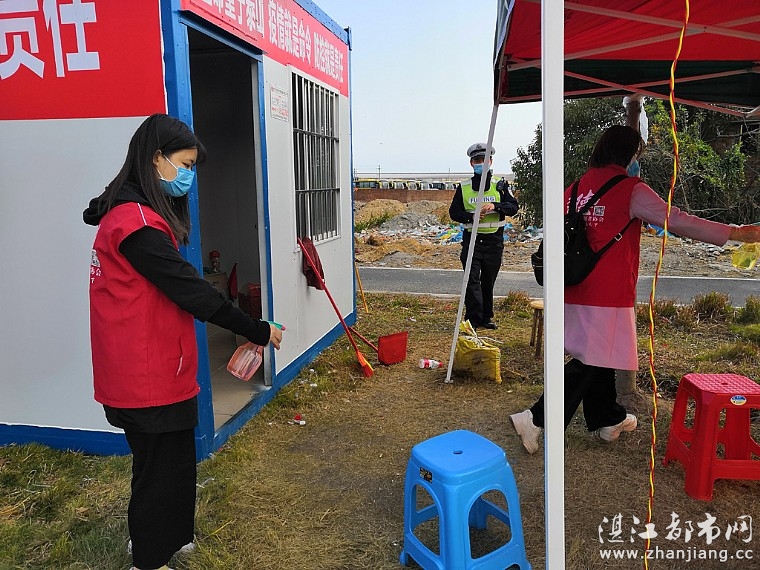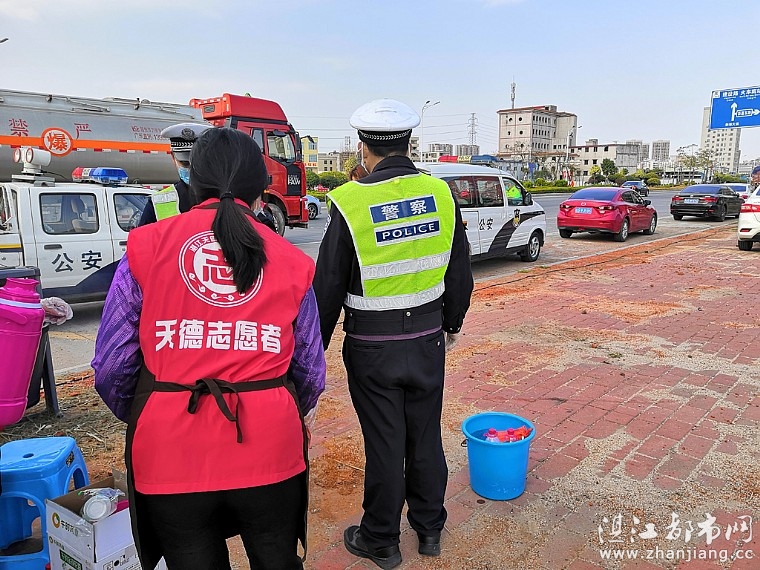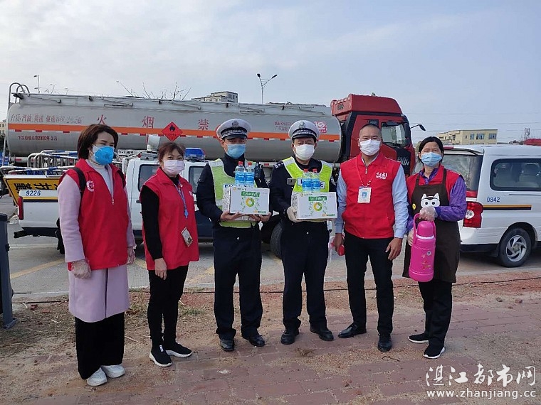 在湛江市天德志愿者协会陈建军会长的带领下,阮建英、袁马迁、李日青、黎桂贤、谭淑丹等志愿者来到新湖大道防疫检查点为民警和医护人员送上暖身的姜茶、金银花露还有消毒的酒精,并对警员休息室进行清洁消毒。