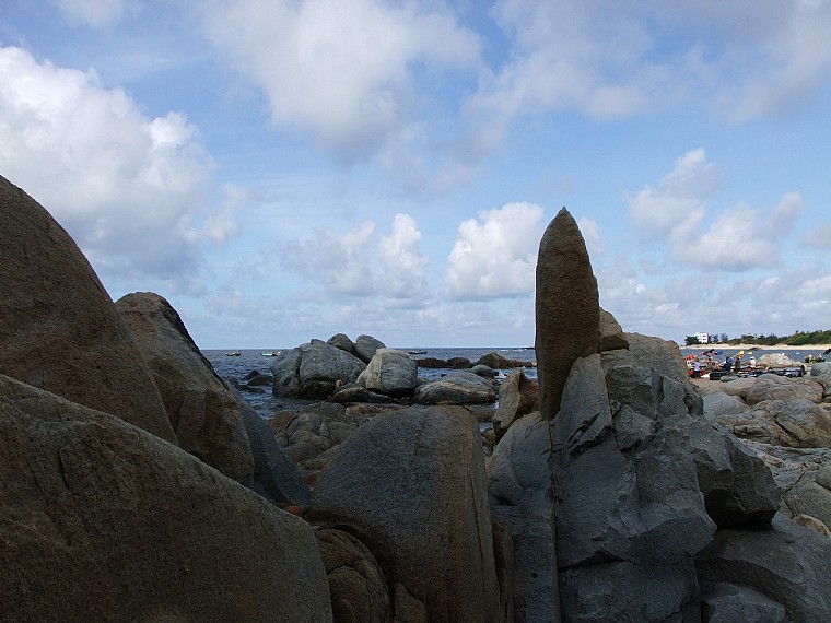 阅读(2678) 回复(3) 查看全文>> - [2013-07-22]调德海之夏(2) [图]调德海拥有全省著名的大型基岩海岸,海岸曲折,海岸线绵长,海面一望无际,水清见底,水质纯净,海滩宽阔,沙质松软洁净。特别是退潮后,宽阔的沙滩中裸露的奇形怪状的礁石,散落在海边,令人无比惊叹大自然的鬼斧神工。其中著名的据说有南天一石、青蛙石、乌龟石、光棍石、情侣石、妹马石等等。海滩上还有一座海沙岭,整个岭全都是沙,最高处离地面有十多米,从海滩上赤脚爬上海沙岭,再像孩子一样从沙山上滑下来,别有一番情趣。 调德村是个小渔村,村民的住房就建在海边,高高低低,错落有致。涨潮时,渔民满载而归,一天辛苦收获的海产品,刚抬上岸,就被早已在岸边等候多时的收货商人抢购一空。而一艘艘渔船,就静静地停泊在岸边,随着海浪轻轻摇荡。