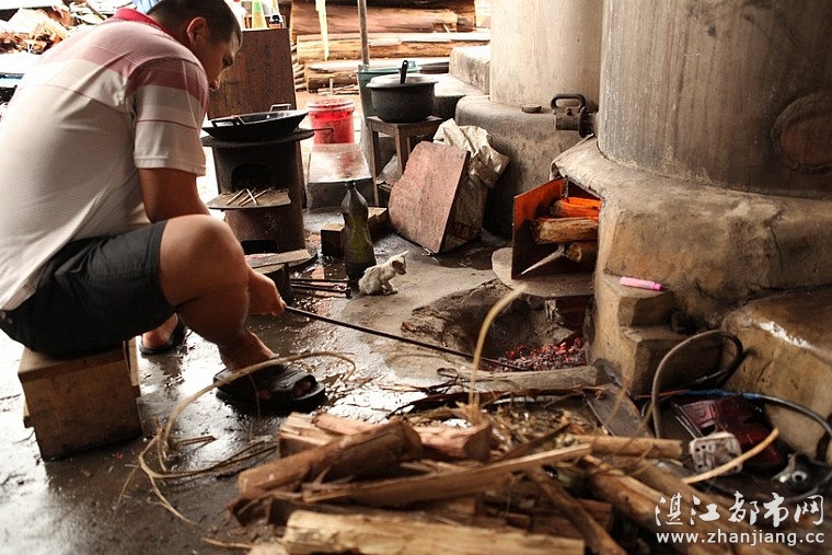 老黄家在调顺岛,酿“土炮”已经有三十多年了,技术是妻子陈桂梅从遂溪桃溪村的娘家带来的,刚开张时,用的古老的传统工艺,以一口大铁锅煮饭,每天煮一百斤米,干到汗流浃背,熏得眼都睜不开。老黄改用锅炉蒸饭后,每天就能蒸五百斤米的饭了。