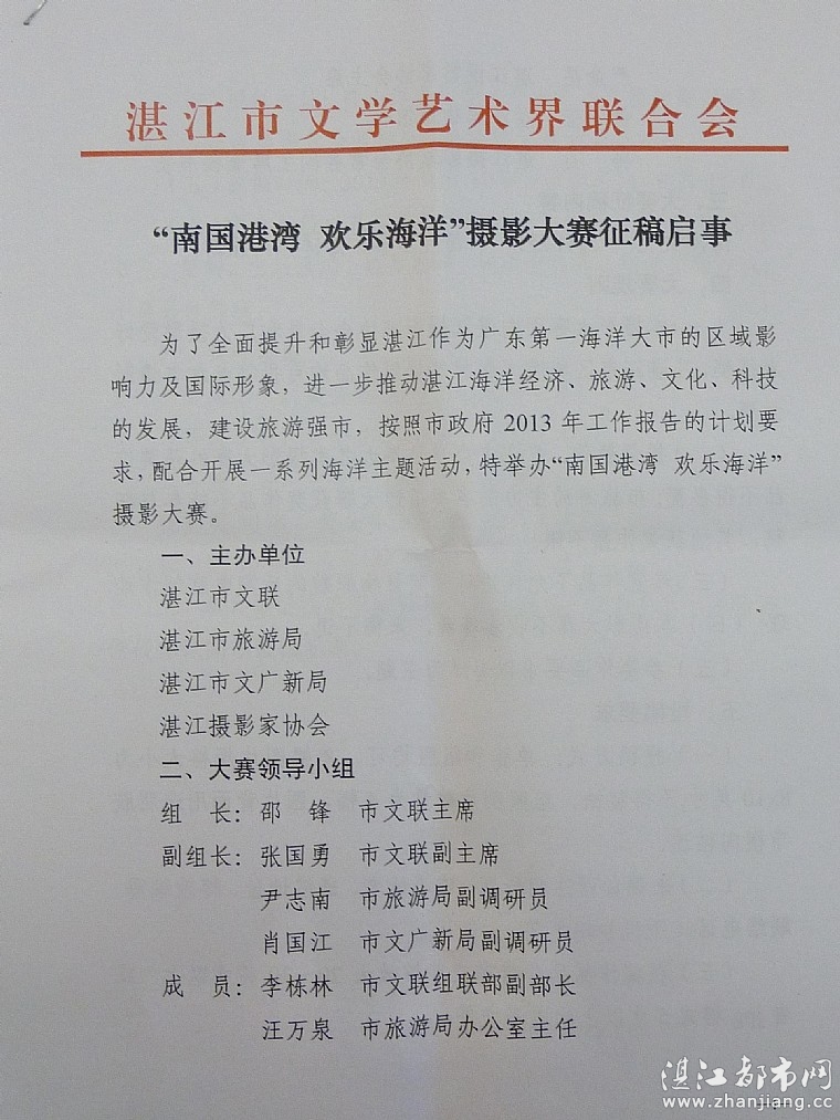 一、主办单位湛江市文联、湛江市旅游局、湛江市文广新局、湛江摄影家协会