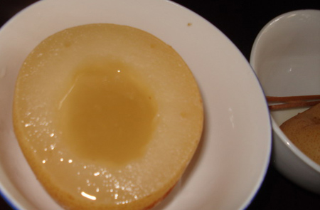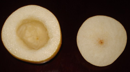 2:然后把另外3/4梨的核挖掉,挖成一个梨盅。