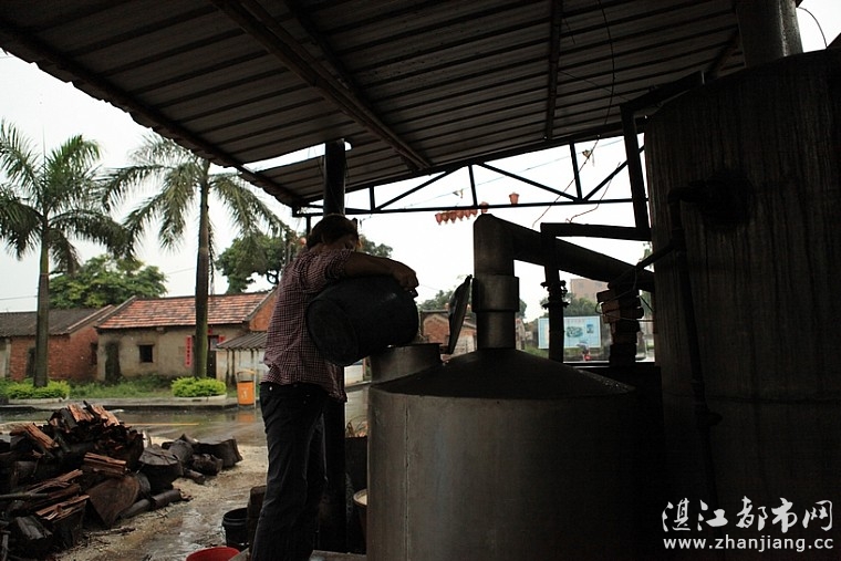 上午七点钟,老黄一家便忙碌起来,妻子和儿子从屋内推出一缸缸酒糟,再一桶桶地提上蒸酒炉,儿媳负责“睇火”。经一个多小时蒸煮后,清亮的酒液就从蒸酒炉的管口流到酒桶里,这时,满屋里飘着醉人的酒香。