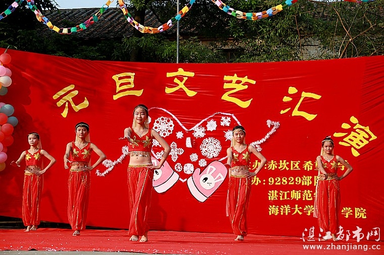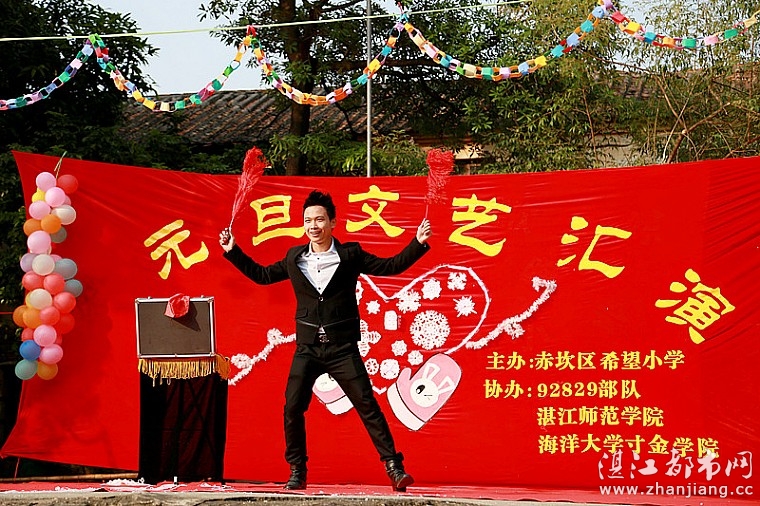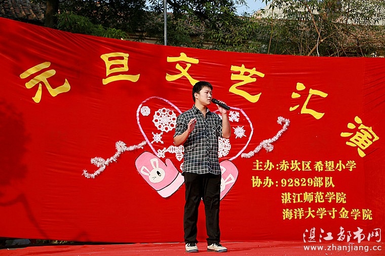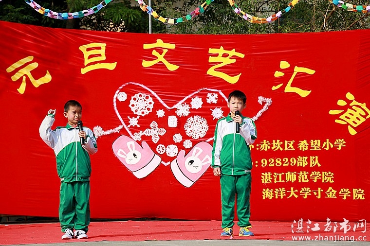湛江都市网讯(图/文:燕燕于飞)2013年12月24日下午,湛江市希望小学操场的舞台上歌声飞扬,舞彩蹁跹,笑声不断,喜乐欢庆。92829部队官兵、湛江师范学院师生、广东海洋大学寸金学院师生带着节日的祝福来到湛江市希望小学,与师生们一起举行元旦文艺汇演。 92829部队官兵们为希望小学的孩子们表演军体拳,湛江师范学院和广东海洋大学寸金学院的同学们则为孩子们表演民族舞、手语舞、魔术和弹唱等等精彩节目,现场的掌声和喝彩声不断。希望小学的孩子们也纷纷亮出自己的看家本领,舞蹈、朗诵、京剧和大合唱等等表演节目,吸引了附近的居民前来观看。文艺汇演过后的有奖问答,孩子们都积极举手,踊跃抢答问题,台上台下打成一片,令整个校园洋溢着欢庆欢聚的氛围。