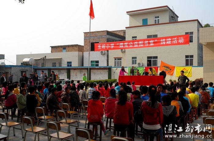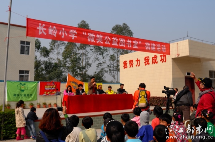2014年1月5日上午,筹备了半年多的“微笑公益”助学平台正式开启第一间图书室捐建,首个捐建对象是位于廉江市和寮镇的长岭小学。当日清晨7点左右,志愿者队伍陆续来到麻章集合点,开始物资装载和分配工作。据统计,本次捐赠物资主要有市少年儿童图书馆投放的2000册图书、捐赠的桌子、报刊架一批,以及由越野e族湛江中队、纵横大地及桃花岛俱乐部捐赠的96张椅子、322套文具、4个书架、8台风扇等一大批物资,由22辆志愿者车辆运送到长岭小学。