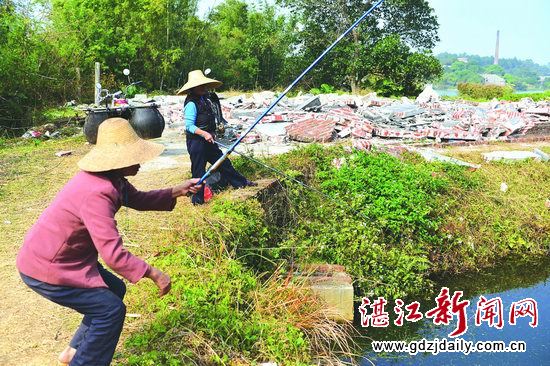 离开水专鱼塘,记者来到雷州青年运河管理局试验场。刚下车,一排建筑残垣呈现在记者眼前。据目测,这里被推倒拆除的猪舍有好几百平方米。猪舍的旁边就是一个鱼塘,两位老婆婆正在鱼塘边钓鱼。