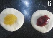 松弛好的面团再次压扁排气,包上果酱,封好口,整形成圆形。