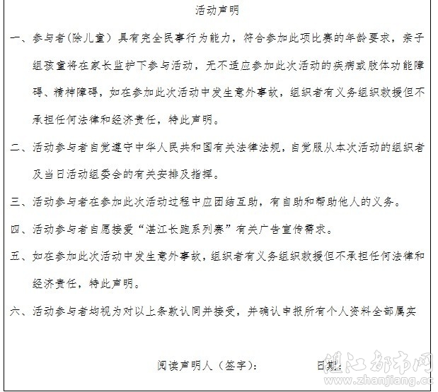 亲们,以“运动、乐活、公益”为主题的“公园一号杯”为爱奔跑第四届南国万米挑战赛来啦! “运动”野蛮您的身体、强健您的体魄! “乐活”倡导健康、快乐、环保、可持续的生活态度! “公益”延伸您的自我价值,做正能量的传播者,分享爱、感受爱! “公园一号杯”第四届南国万米挑战赛的公益主题是“为爱奔跑”,活动将筹集资金委托“微笑公益助学平台”为廉江市和寮镇佳场村佳场小学公益图书室修缮墙体、改善照明、升级书架、增添书籍、美化阅读环境! “为爱奔跑”,让我们关注、关心、关怀湛江边远地区留守儿童的精神世界,丰富他们的课外生活,温暖他们的内心世界,让他们“有书读、读好书”,期待您的参与! 跑步,是随时、随地都可以进行的一项运动。跑步,不爱的人觉得它单调、辛苦,爱的人,总能感受到身心飞扬,漫漫跑途,既是强健身体,又是自己曼妙的独处时光! 南国热带花园空气清新、草木葱茏,一条长约2.3公里的柏油路环绕整个园区,是目前湛江最好的跑步健身场所之一。 各位亲,我们在等待您的加入,一起来挑战自我、展现自我、绽放微笑吧! 一、赞助单位:湛江公园一号 二、主办单位:湛江市铁人三项俱乐部 三、协办单位:湛江都市网、UCC自行车、慈铭体检、体创健身中心、皇家经典高级婚纱摄影、搜房网、湛江购房网、腾讯房产湛江站 四、公益组织:微笑公益助学平台http://weixiao.zhanjiang.cc,捐赠项目:湛江廉江市和寮镇佳场小学公益图书室 五、活动时间:2014年4月27日(星期日) 六、报名截止时间:2014年4月20日17:00 七、活动地点:湛江市南国热带花园 八、报名地点:湛江市赤坎区体育南路218号公园一号营销中心及其它指定报名点 九、报名网站:湛江都市网www.zhanjiang.cc 十、报名咨询电话:0759-8886888 13560527925 十一、活动内容: 【一】万米挑战赛:参与办法参照第十二条万米比赛报名办法。 【二】现场义卖集市:参与办法参照第十三条公益义卖、集市,个人、团体报名要求和办法。 【三】图书捐赠:微笑公益助学平台现场接受来宾图书捐赠,欢迎大家携带适合少年儿童的读物捐赠给微笑公益,让我们一起把微笑送到需要的孩子手里! 十二、万米比赛报名办法: (一)比赛分组和要求: 1、男子组和女子组所有选手需年满18岁以上70岁以下,报名时都必须提供有效身份证信息。 2、亲子组以家庭为单位,父母2人加至少1名孩童。 3、所有参赛选手都须保证参赛时身体健康,适合比赛。 4、参赛人员必须穿统一比赛服或标识。 (二)奖项设置: 每组奖励前十名,奖品丰厚。 (三)报名费用: 男子、女子组比赛报名费:10元/人,亲子组报名费20元/组;每个参赛选手都将获得比赛服一件,保险一份。 (四)报名方式 (1)指定报名点报名:在指定报名点填写《报名申请表》,并缴纳报名费。 (2)网络唯一指定报名: 男子组报名网址链接:http://www.zhanjiang.cc/bbs/thread.asp?Tid=106200 女子组报名网址链接:http://www.zhanjiang.cc/bbs/thread.asp?Tid=106198 亲子组报名网址链接:http://www.zhanjiang.cc/bbs/thread.asp?Tid=106201 在湛江都市网的报名公告贴中按要求报名,下载填写《报名申请表》 支付1:支付宝支付(推荐) 支付宝帐号:13560527925 支付宝账户名:林少萍 地址:https://www.alipay.com 卡号:6227 0031 3072 0085 005 户名:林少萍 注:为了便于我们核对收款,支付宝、银行转账汇款后请务必发短信到手机13560527925,填写内容:姓名+银行卡号4位尾数+身份证号码。 (3)其他友情宣传网络平台、企业、公司、社团、QQ群团体,可以组织团体报名,由于名额有限,应尽快知会主办方。 (4)报名截止时间为2014年4月20日,额满自动截止,主办方会及时在湛江都市网等网络支持平台上公示参赛人员比赛编号。 十三、公益义卖、集市,个人、团体报名要求和办法: (一)个人:有九成新以上的义卖物资,物资数量不限,义卖后所得五成或全部作为“微笑公益图书室”援建资金。 (二)组织、公司:有一定数量价值在500元以上的全新义卖物资,义卖后所得利润五成或全部作为“微笑公益图书室”援建资金。 (三)报名办法:联系人:木言,电话:13560527925;梅子,电话:13828289179。 十四、活动时刻表 7:30 公益商家到达南国公园活动指定现场搭建各自展架,比赛义工到达公园一号销售中心门口现场,签到,领各小组物料,准备活动 8:00—8:30 选手检录(检录地址:公园一号销售中心门口,选手检录需出示身份证原件或复印件) 8:30—9:00 主持人宣布活动开始,赛前致辞,赞助嘉宾讲话、主办方讲话,主持人申明此次活动主题,集体大合影 9:15 男子组比赛开始 9:30 女子组比赛开始 10:30 亲子组比赛开始 11:30 主持人开始主持颁奖,公益商家义卖所得捐赠给微笑公益助学平台仪式,颁奖地址公园一号销售中心门口活动现场主题背板前,各嘉宾给此次活动颁奖,嘉宾与获奖运动员在主题背板前合影,与义工合影等 12:30 义工收拾场地 十五、比赛路线 南国公园内指定起点逆时针奔跑,女子组2圈共计4.6公里,男子组4圈共计9.2公里,亲子组1圈共计2.3公里。