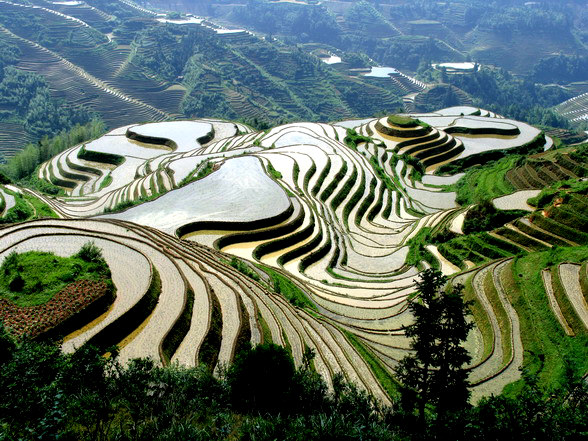 龙脊梯田是一个规模宏大的梯田群,梯田海拔最高1180米,最低380米,共分为金坑·大寨红瑶梯田观景区、平安壮族梯田观景区、龙脊古壮寨梯田观景区。线条行云流水,潇洒柔畅;规模磅礴壮观,气势恢弘,有“梯田世界之冠”的美誉,比起精致的巴厘岛德格拉朗梯田壮丽许多从山脚盘绕到山顶,小山如螺,大山似塔,层层叠叠,高低错落。从高处望去,梯田的优美曲线一条条、一根根、或平行或交叉,蜿蜒如春螺、披岚似云塔,显示了动人心魄的曲线美。
