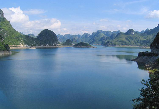 大龙湖景区由大龙湖和大龙洞两部分组成,总库容为1.51亿立方米,湖的最深处达180多米,湖中有14个天然小岛,湖面碧水连天,四周群山环抱,石峰依肩并立,青山倒影浑然一体。依傍湖岸的大龙湖景区以其秀美景色,被游人为“中国的下龙湾”。
