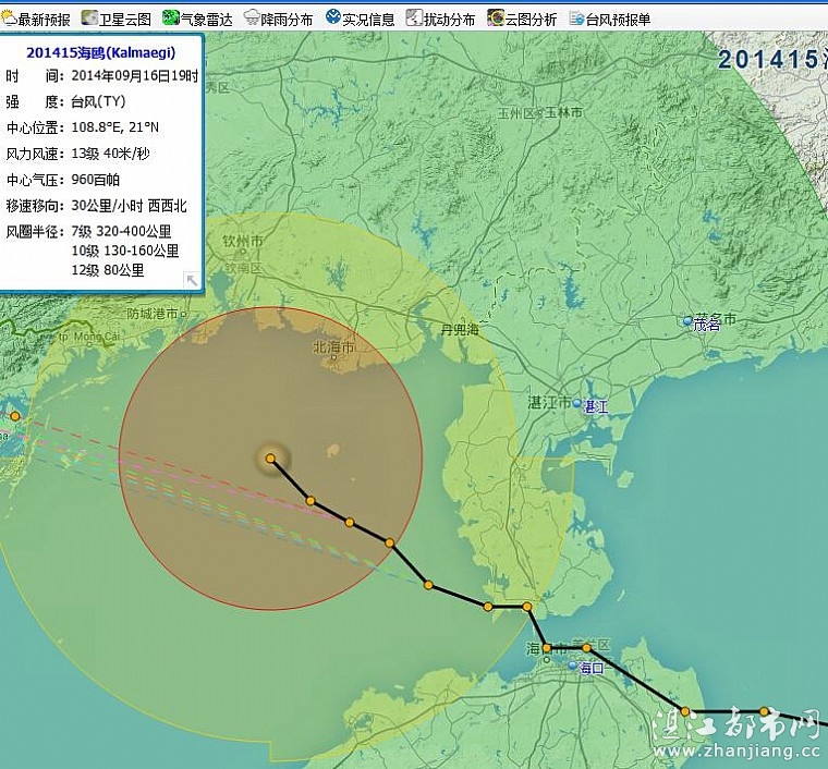 台风“海鸥”12时45分前后在广东徐闻南部沿海(角尾湾)再次登陆。登陆时强度为台风级(13级,40米/秒),960百帕。