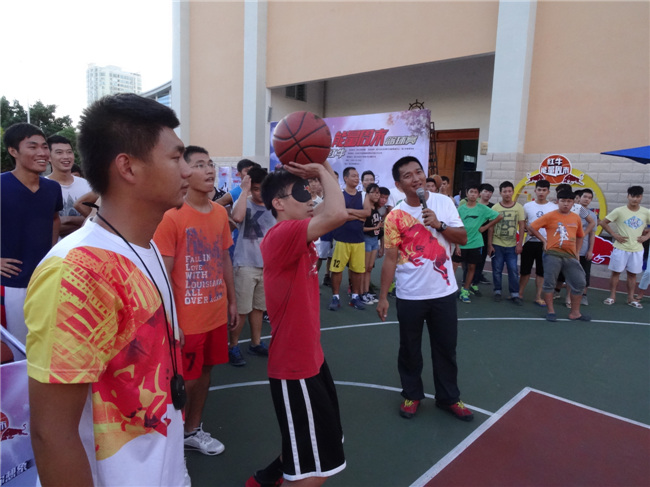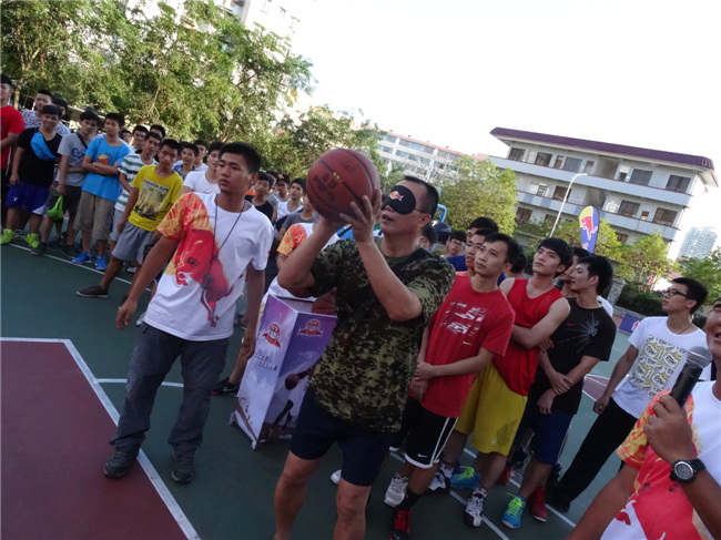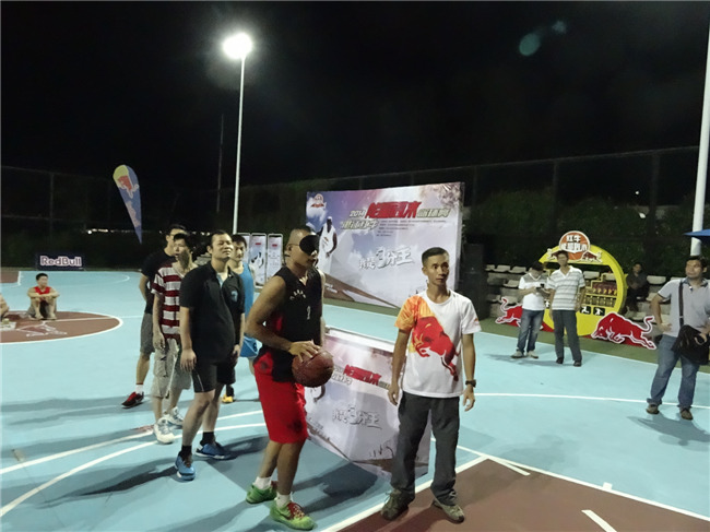 盲投——黑暗中的正能量(赛事穿插趣味小游戏,缓解比赛紧张的氛围,也为现场增添更多乐趣,成功投进球的选手还能获得红牛赠送的魔术头巾等小礼品)