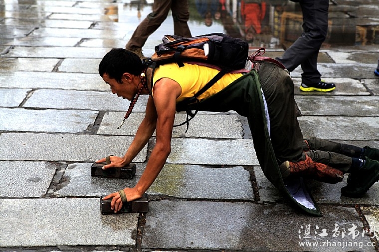 广场上也有几个膜拜者,其手持铁制的方盒,朝天举起,再下跪,双手向前推出,将身体俯卧在地上,再站起来,周而复始的。经过的信徒们很为他的行动而感动,纷纷解囊。而我们却很怀疑他们的虔诚,因为,他们的动作,是有人经过时才做,当无人时,他们就坐在路边休息,再也不动。此状况几天如此。