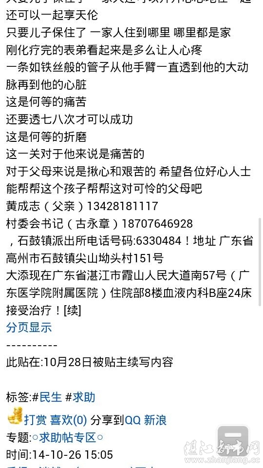 2014年10月30日,收到茂名名爱志愿者总队转发的一则求助信息,内容如上,现在