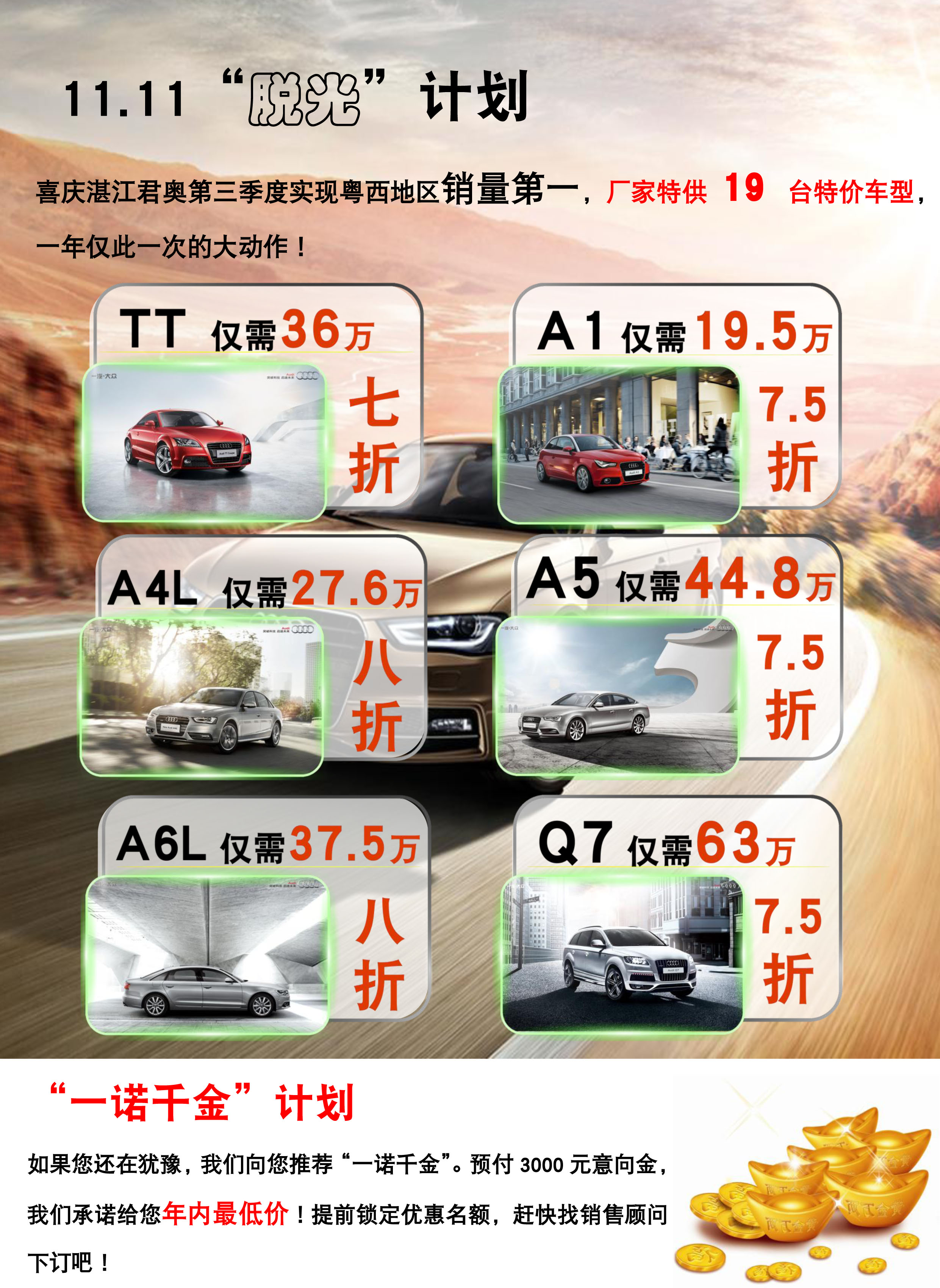 本次“双11脱光计划”活动一年就一次,湛江君奥第三季度粤西地区销量第一,厂家才给到这样的巨幅优惠。由于名额有限,不是每个人都可以参加的,必须是接到我们销售顾问电话通知后,有登记备注才行,而且每个销售顾问只有两个名额。提前锁定优惠名额,赶紧行动吧!