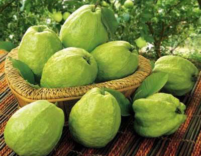 番石榴(学名:Psidium guajava)为热带、亚热带水果,原产美洲,现在华南地区及四川盆地均有栽培,香甜可口。成熟的番石榴为浅绿色,果皮脆薄,食用时一般不用削皮,果肉厚,清甜脆爽。其含有较丰富的蛋白质、维生素A、C等营养物质及磷、钙、镁等微量元素,是非常好的保健食品,也是防治高血压、糖尿病和肥胖症及肠胃不佳的患者最为理想的食用水果。
