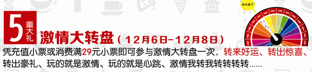 凭充值小票或消费满29元小票即可参与激情大转盘一次,转来好运、转出惊喜、转出豪礼、玩的就是激情、玩的就是心跳、激情我转我转转转转。。。。 |