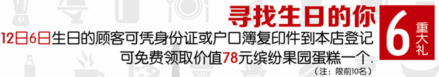12日6日生日的顾客可凭身份证或户口簿复印件到本店登记可免费领取价值78元缤纷果园蛋糕一个