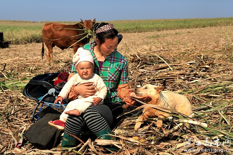正是甘蔗收获的季节。四外是人们忙碌地砍蔗、装运的身影。在海鸥农场的一条乡间小道旁,有几个年轻人引起了我们的注意,与他们交谈中,得知他们其中一对是夫妻,来自云南省文山县,男的40岁,姓罗,汉族,女的姓李,80后,壮族,当年,夫妻双双从云南老家来到这里,十年艰苦创业,已在这里扎下了根,生了两个女儿,大的上学了,小的才几个月,还要吃奶,只好带到田边,边劳作,边照顾。