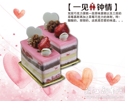 一见钟情双层巧克力蛋糕一层原味蛋糕以及三层的草莓慕斯再加上草莓巧克力的淋耐,哗!酸酸的、甜甜的、这就是恋爱的味道...