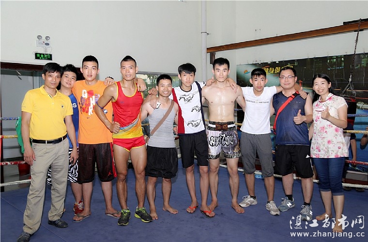 湛江都市网讯(图/文:燕燕于飞): 赛前热身。 当天下午,阳光健身俱乐部内,一众坚挺堂成员、自由搏击龙之队队员和健身会员集聚在擂台周围,为一睹擂台上对决的英姿。肖明隆是自由搏击龙之队全体队员的散打教练。龙之队的师兄弟们和笔者纷纷前来支持教练。赛前,肖教练表现得异常轻松,如往日训练一般,先进行跑步热身,然后踢打沙袋,练习拳腿组合。大师兄涂老师为教练带来了牙套,教练不习惯戴,并没戴上打比赛。师弟阿东亦带来了他的火红色Twins真皮拳套。教练正是戴着这对拳套,迎战金教练。反观金教练,戴上牙套护齿,并穿上护裆保护裆部。