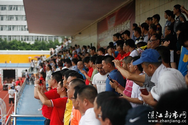 比赛日下午,湛江霞山运动场迎来了久违的热闹,主席台等位置早早就已经坐满了球迷。他们都是湛江狂狼俱乐部的粉丝。许多家长也带着小孩来观看球赛,而许多球迷也来到了现场为本土球队加油助威。