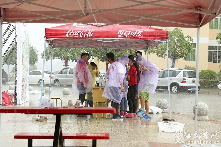图为下雨的时候,学生们在可口可乐帐篷下避雨