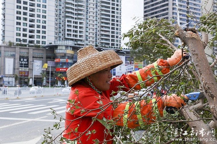 图为园林工人清理路边倒下的树枝