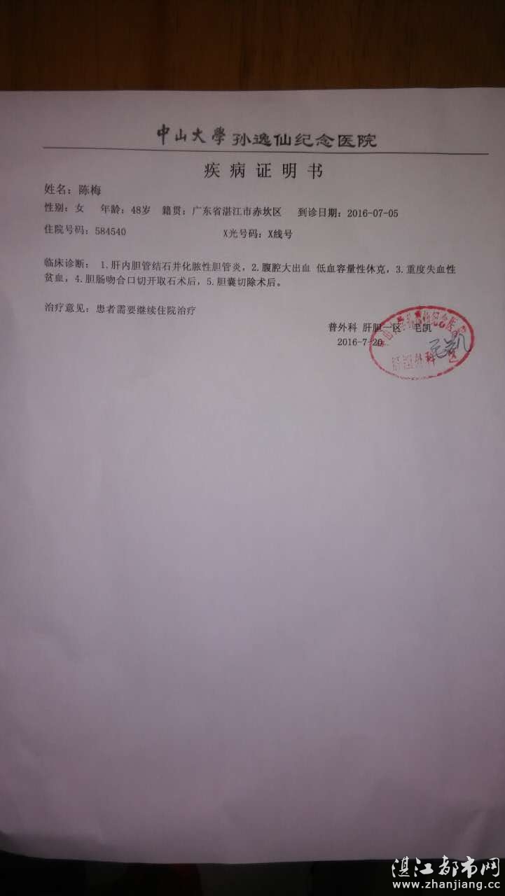 经过多番打听询问到广州孙逸仙二院南院治疗。经教授检查后告知:“必须再次开刀,要把胆管内的石头取出!”因为梅姐腹石头长得太又快又多,2003年的那次手术,她的胆已被切除,没有胆,进食时严重感染,不做手术随时会有生命危险,手术费用保守估计需要三十多万。可是,钱从哪里来?这个消息让我们这七、八口人住在一间二、三十平方下雨天还漏水的房子人家几近崩溃。