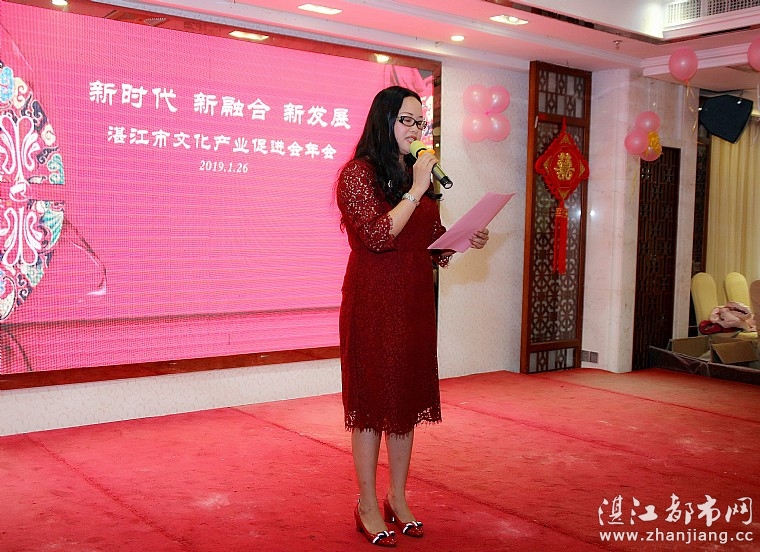 当天晚上,湛江市文化广电旅游体育局局长彭晖女士在致辞中,代表市文化广电旅游体育局对文促会年会的举办表示热烈祝贺。她对协会过去一年的工作给予肯定,并且希望文促会于湛江打造广东重要的发展级,加快省域副中心城市的建设中,能够适应新的形势发展,把今年作为新的起点,在文化产业与科技、金融、旅游、体育等相关产业的融合发展上,走出新的路子,发挥新的作用与新的担当。
