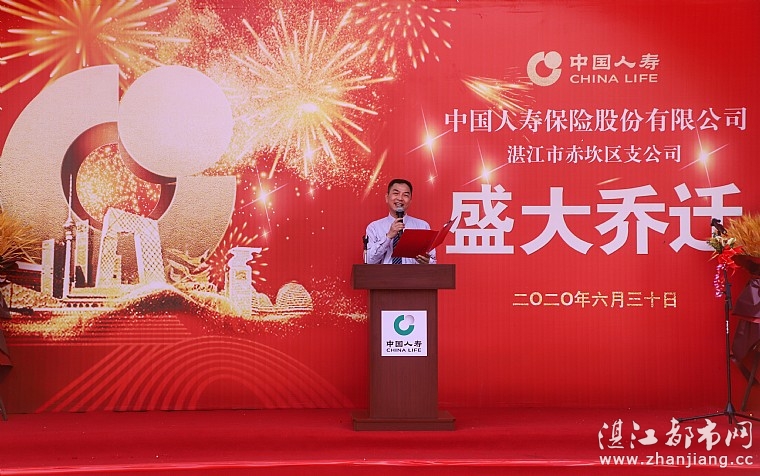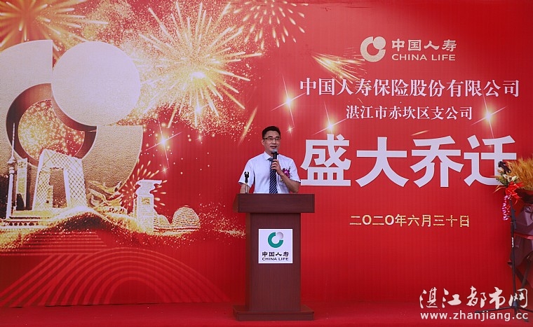中国人寿保险股份有限公司湛江分公司党委书记、总经理陈庆操先生在致辞中,祝贺中国人寿保险股份有限公司湛江市赤坎区支公司办公职场乔迁。他介绍中国人寿连续17年入选世界财富500强,连续14年入选世界品牌实验室“中国500最具价值品牌”,2019年市场份额和资产规模占据国内寿险市场的龙头位置,并通报湛江国寿2019年取得骄人的业绩,以及今年疫情期间主动承担服务社会民生的责任。他寄语中国人寿保险股份有限公司湛江市赤坎区支公司把握新职场搬迁的机遇,为公司高质量发展做出更大的贡献。