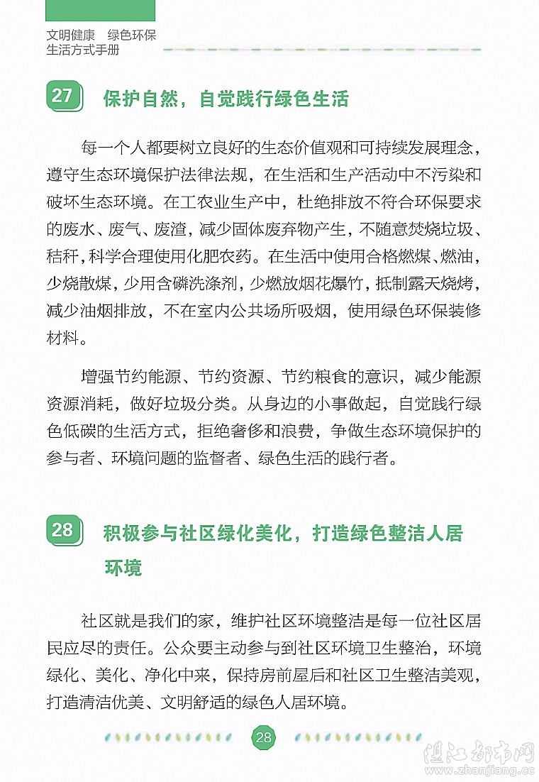 情暖湛江宣传部讯(文|燕燕于飞):2021年4月是全国第33个爱国卫生月。全国爱卫办、中央文明办、健康中国行动推进办指导,中国健康教育中心组织编写《文明健康 绿色环保生活方式手册》。这本手册从讲文明、铸健康、守绿色和重环保4个方面,介绍如何在日常生活、工作和学习中积极践行文明健康、绿色环保的生活方式,增强公众的节约意识、环保意识和生态意识,维护自己和家人的健康,实现可持续发展。