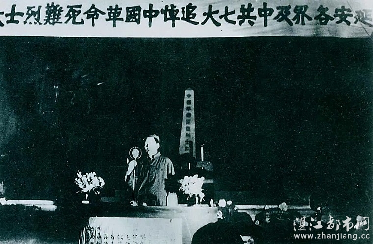1945年6月17日,中共七大代表及延安各界代表在中央党校大礼堂,举行中国革命死难烈士追悼大会。图为毛泽东致悼词。