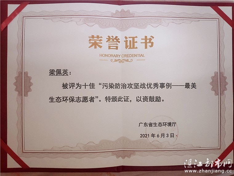 下午,湛江市社会组织党委在湛江市档案馆举行2021年新党员入党宣誓仪式及参观学习党史教育展览活动。活动中,“情暖湛江”会长梁佩英湛江市社会组织“优秀共产党员”荣誉证书。晚上,梁会长收到广东省生态环境厅颁发的2021年十佳“污染防治攻坚战优秀事例”最美生态环保志愿者荣誉证书与牌匾。在举国庆祝建党百年华诞的日子里,梁会长一人荣膺省、市3个奖项,为“情暖湛江”树立先进典型,也树立学习榜样。