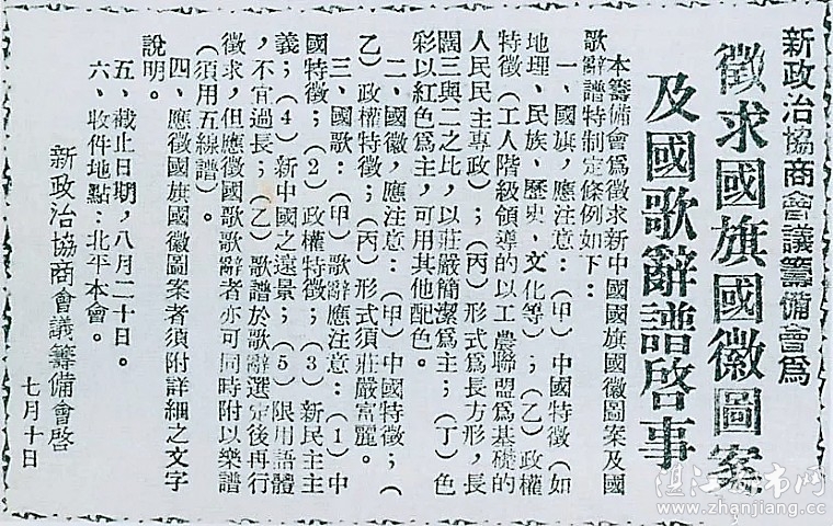 1949年7月10日,新政治协商会议筹备会决定公开向全国征集国旗、国徽图案和国歌词谱。图为《人民日报》刊登的征集启事。